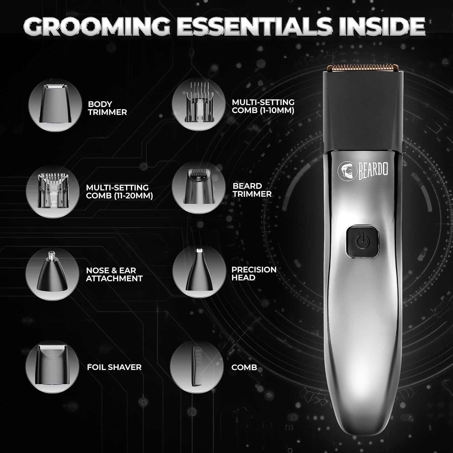 Beardo Chrome Beast Multipurpose Full Body Groomer Trimmer Set For Men | 40 Length Settings | 8 attachments | Beard/Hair/Body/Precision/Ear/Nose Trimmer|With Dock|90 min. run time | All-in-1 trimmer