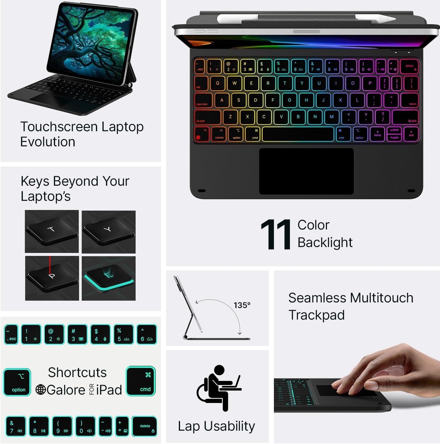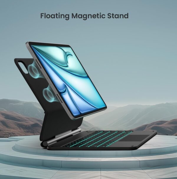 Designed with a Magic Keyboard–inspired floating cantilever style, it allows smooth angle adjustment for comfortable viewing and typing. The full-size backlit keyboard offers responsive, quiet keys suitable for long typing sessions, while the integrated precision trackpad supports iPadOS gestures for efficient navigation and multitasking.