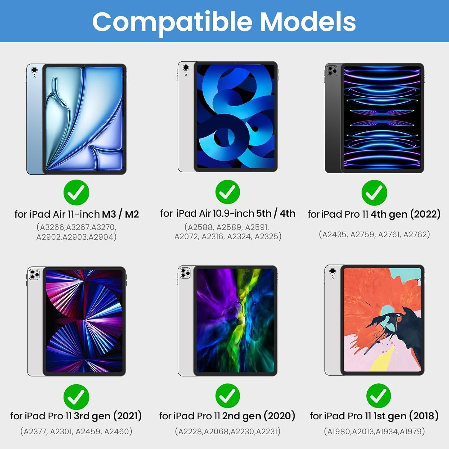 It supports iPad Air 11-inch (M2 2024, 5th & 4th Gen) and iPad Pro 11-inch (1st to 4th Gen).