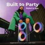 A: It delivers 100W output with four dynamic speakers and a Party Bass Booster for loud, deep, and impactful audio.